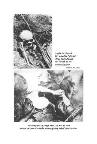 Một bà lão bán nước bên cạnh chùa Phổ Minh (Nam Định) chết đói, thịt rữa hết, chỉ còn trơ xương (1945) Ảnh: Võ An Ninh Trên đường Phủ Lý, huyện Bình Lục, tỉnh Hà Nam, hai con xin cháo đổ vào mồm bố nhưng không biết bố đã chết (1945)
